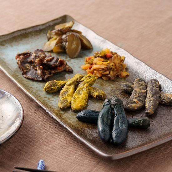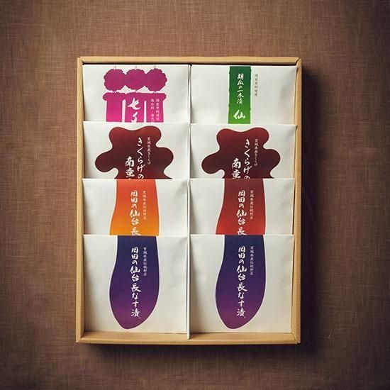 伝統野菜「仙台長なす」を醤油・からし・仙台味噌でそれぞれ味付けした三種の「仙台長なす漬」に、大きめのきくらげを青唐辛子の辛味とともに仙台味噌で仕上げた「きくらげの南蛮みそ漬」、七種の野菜を細かく刻み仙台味噌で漬け込んだ「七夕漬」、胡瓜を丸ごと淡口醤油で味付けした「仙台っ子(胡瓜の一本漬)」との詰合せ。